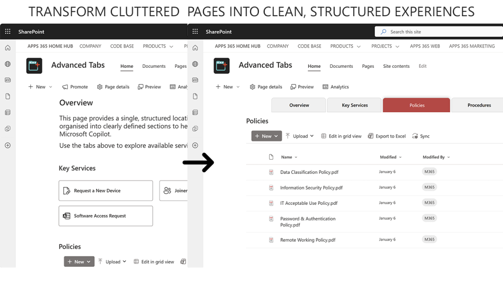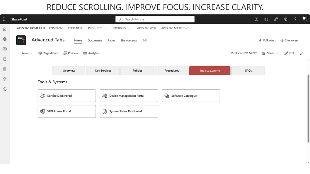 Instead of stacking multiple web parts vertically, Advanced Tabs groups related content into clearly labelled tabs, reducing scrolling and creating clean, application-style page layouts. Users can switch sections instantly, focus on relevant information, and navigate large pages more efficiently.