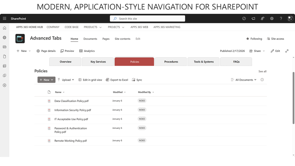 Advanced Tabs is a modern SharePoint Framework (SPFx) Tab web part designed to improve usability, navigation, and content structure in SharePoint Online.